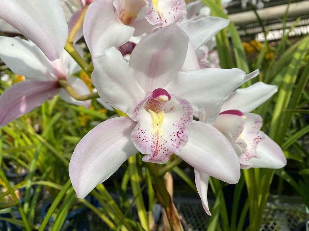 Deze Cymbidium vormt stevige pollen met smalle, langwerpige bladeren die boogvormig uitgroeien. Vanuit de basis ontstaan bloemstelen die vaak meerdere bloemen tegelijk dragen, waardoor de plant in het bloeiseizoen een volle uitstraling krijgt. Cymbidiums staan erom bekend dat ze in de koelere maanden kunnen bloeien en dat de bloemen lang mooi blijven, zeker wanneer de plant niet te warm staat.